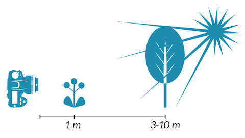 Das fokussierte Hauptmotiv Ihres Fotos sollte in etwa 1m bis 3m entfernt sein. Der Abstand zwischen Motiv und Hintergrund sollte weitere 2m bis 10m betragen. Je kontrastreicher der Hintergrund ist, desto mehr Seifenblasen bilden sich. Am besten eignet sich ein unruhiger Hintergrund mit starkem Gegenlicht wie lichtdurchflutete Bäume, Lichter einer Skyline bei Nacht oder Lichterketten.